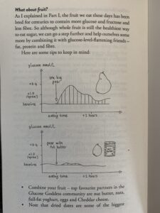 We are meant to eat fruit and vegetables, nature intended us to eat them – plants contain both starch and sugar but importantly fibre too. The fibre in the veggies or fruits help slow down the body’s absorption of glucose.